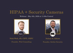 Security cameras are important tools for protecting your people, patients, and practice, but can create privacy concerns. Join this free mythbusting session with experts Nick Weil, JD, CIPT, CHPC, Founder of Weil Consulting and Nelson Elliott, Founder of Settler Security to hear what HIPAA actually says and learn what additional security options you might have.